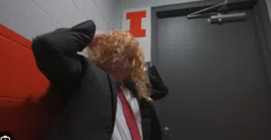 GARDO! The story behind the wig: Apparently Illinois gave out wigs as a fan-giveaway last night to honor one of their players, Jake Davis: So after knocking off the Illini in OT, Gard decided to have fun with one of those wigs as the Badgers celebrated in the locker room. Fun! Or, as Illinois fans put it in the comment sect...