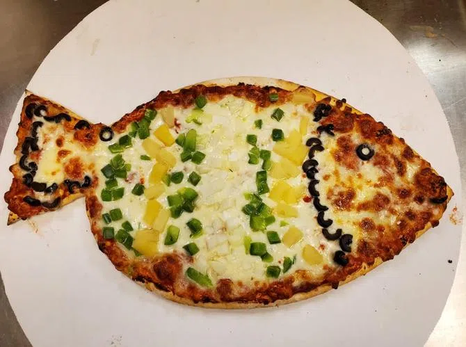Di Stefanos Pizza Palace in Milwaukee are offering a fish shaped pizza along with a free order of garlic bread. Topped with onions, green peppers, pineapple, and black olives. How do you cut a fish shaped pizza? Do you start with the tail? The pizza is only available on Fridays through Lent! Check out the full story below!